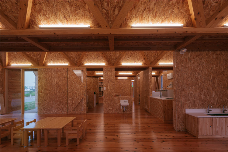 屋頂結構采用折疊板設計,無柱空間是通過運用木桁架梁屋頂結構實現的,形狀像一塊折疊板。所有支撐屋頂結構的承重墻都被布置在建筑外圍。現在這座建筑分成了兩個保育室、衛生間等,但將來也可以轉換為一個大房間。