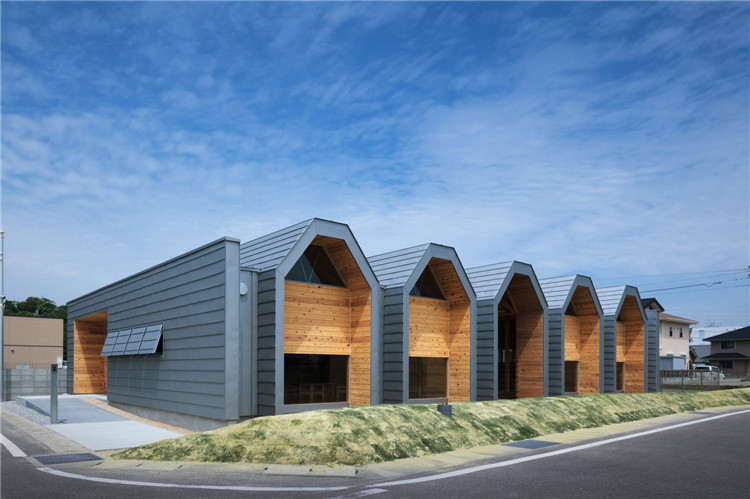 “T-nursery”這個名字完美詮釋了組成這個項目的三大支柱概念:木材、構架及梯形形式。這座幼兒園位于福岡郊外,為方便日后擴建等改動,由一系列重復的模塊組成。外圍墻面由荷載支撐結構組成,支撐了跨度9米的無柱空間,方便各種用途(游戲室等)的轉換。為室內空間提供最大限度的靈活性。木桁架梁在工廠安裝,用拖車運送到施工現場。復雜的連接也是在工廠制作的,只有一個相對容易的連接在現場組裝。這樣的方式提高了施工精度,縮短了施工工期。