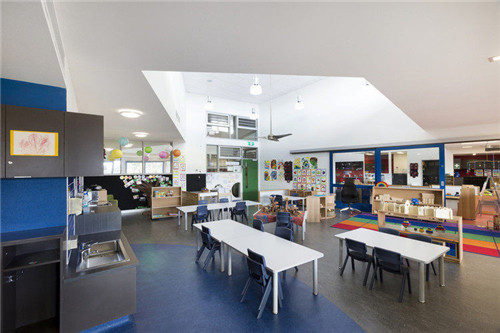 該建筑位于Plenty 河谷的中心位置,以蜿蜒的Plenty河為參照,創(chuàng)建出平滑的墻面和外廊曲線,猶如水流和漩渦穿過中心空間,而屋頂邊線則是對遠處Kinglake山脈輪廓線的呼應。幼兒園設(shè)計