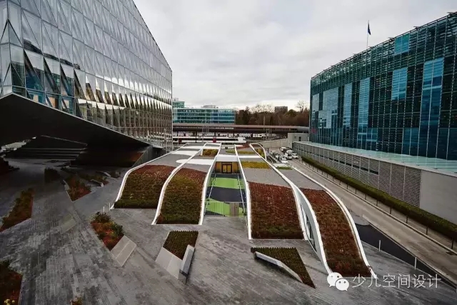 這片兒童區(qū)域與日本國際煙草公司日內(nèi)瓦分部相連。位于日本國際煙草公司與世界氣象組織這兩個大體量構(gòu)筑物之間的幼兒園,被定位為具有功能的景觀建筑。