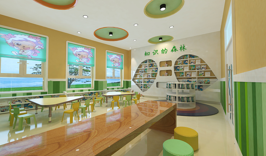 光滑干凈的長桌設計讓孩子們可以在鋪滿陽光的桌子上書寫畫畫的,明亮溫馨的環(huán)境孩子們也會更有學習的氛圍,孩子們圍著長桌一起讀書的畫面,想起來也是醉了,每個小細節(jié)的設計,卡通圖畫、簡約大方的書架....每個角度都是一副唯美的畫面。