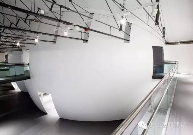 在大廳里,兩個宏大體量較天花板又上升了10米,一個體量繃緊而堅硬,另一個體量柔軟而具有波動性。它們由橋梁相連,人們通過橋梁來回走動。游客會產生“哇”的驚嘆感,并被引入充滿誘惑和想象力的迷人世界,它激發人們的欲望和好奇心來參與學習、探索和創造的過程。