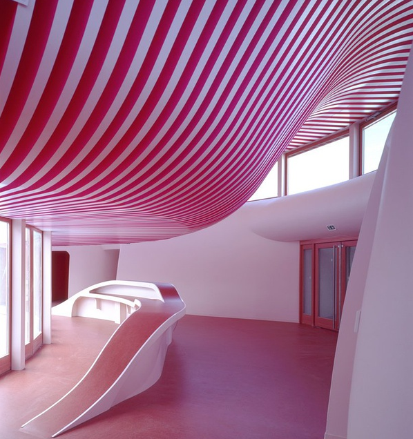 在這個建筑的屋頂和墻面甚至是家具的處理上都采用了波浪弧線的形式,因為這樣的設計可以讓讓室內的空間充滿想象與童趣,同時也在許多屋頂設置了天窗,通過天窗可以讓自然的光線射入室內,幼兒園室內設計采用的是粉色主題,在不同的角度的天窗照射進來的陽光也是多樣化,陽光和粉色裝飾相結合室內也更加的溫馨明亮,自然采光的室內不管是在哪個區域角度去看都充滿了新意和童趣。