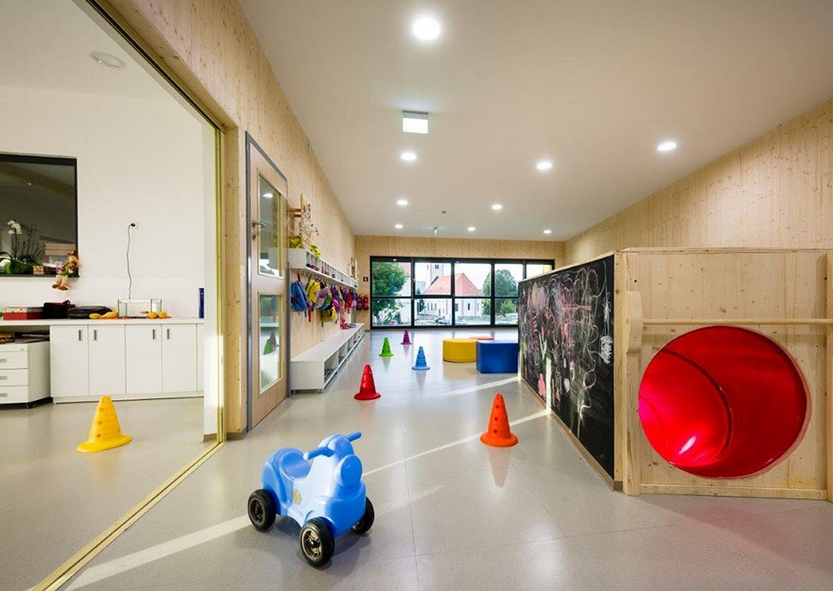 斯洛文尼亞的?martno分時幼兒園是低能耗房屋。幼兒園室內(nèi)設(shè)計的是采用木材裝飾,所有墻面的木材都是當(dāng)?shù)厝〔模@也確保了可持續(xù)建筑的最高標(biāo)準(zhǔn)。建筑十分緊湊,所有的建設(shè)工作包含操場,都僅在四個月內(nèi)完成,北向幾乎沒有開口,南立面則全部對外開放。