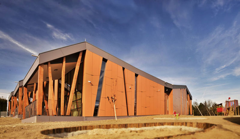 幼兒園和周圍樹木、游樂場(chǎng)設(shè)施緊密連接在一起,整體概念與周邊環(huán)境的體塊和屋頂形式相似。幼兒園設(shè)計(jì)的尺度不會(huì)太大,讓孩子們有一種置身在家中的感覺。建筑師在幼兒園中增加了一些新的程序和功能,讓這種方法成為了Klopotec學(xué)習(xí)方法的新路徑。這種新的方法為孩子們提供了一個(gè)獨(dú)特的空間用來玩耍和學(xué)習(xí)。其空間大小也是非常適合孩子們。