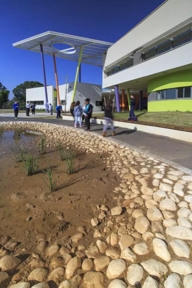 設計師給全校師生設計了一個租金建立豐富變化的繩梯系統(tǒng)平臺,用來觀察和發(fā)現(xiàn)和了解環(huán)境, 學校的“池塘”其實是一處低洼地,在一場大雨過后,就注滿了水形成了池塘。池塘也給學生上了實踐課,不但收集徑流水用于灌溉和園藝,而且提供機會觀察多種多樣的、享受豐富棲息地的生命形態(tài)。