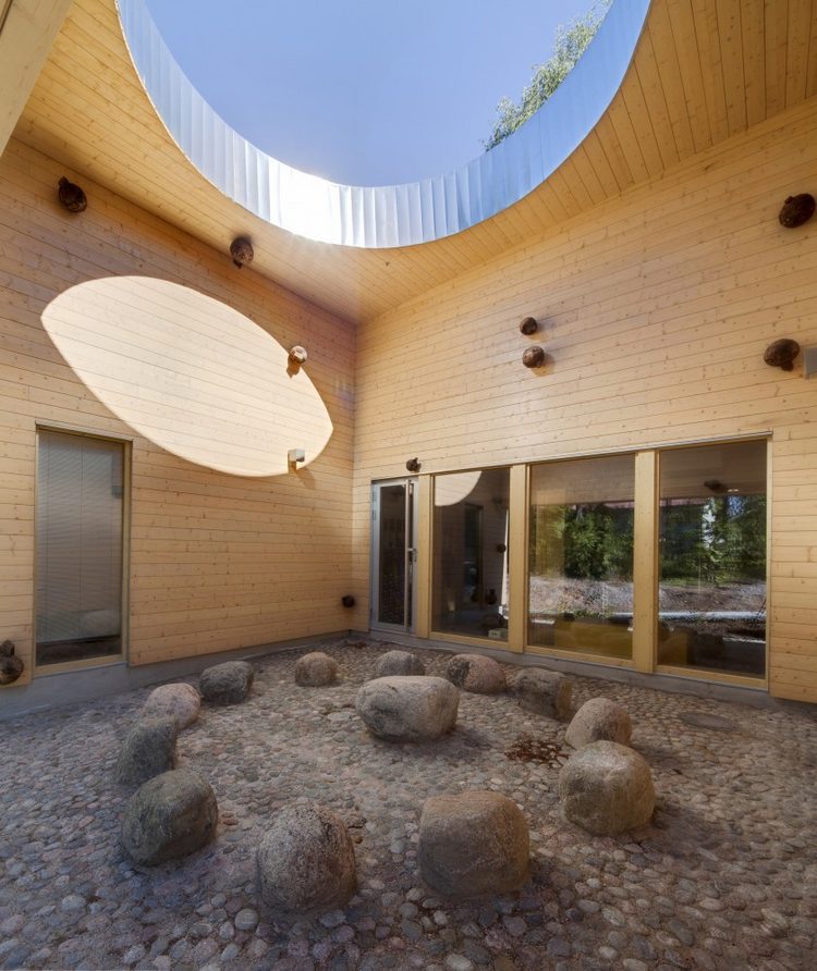 整個建筑鋪砌一新的內部庭院朝向門廳開放,會內的天花板上有一個巨大的露天圓形開口,隨著時間的推移使得移動的陽光成為了室內庭院中一道亮麗的風景,庭院內還有這藝術家創作由20個落葉松木制作的球體組成,代表著宇宙的雕像。(幼兒園室內設計)