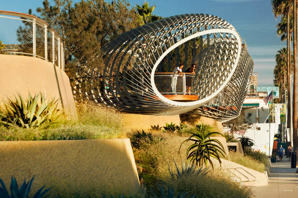 公園內(nèi)最吸引人注意的是造型新穎的觀景平臺,離地平面約18英尺,曲線型網(wǎng)狀涼亭,就像個編織的橢圓形籃子,民眾可站在原木打造的平臺上,俯瞰一望無際的太平洋丶圣莫尼卡碼頭上的摩天輪與海灘上的熱鬧人群。