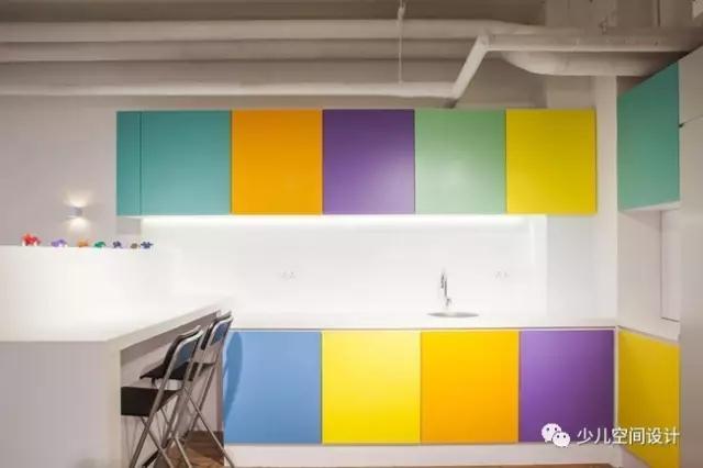 就餐區(qū)和休息區(qū)是專門為家長和老師設計的兩個區(qū)域,他們可以在這里交流溝通孩子的情況。就餐區(qū)在功能上是一個帶有多重色彩櫥柜的敞開式廚房,它這樣的設計還可以激發(fā)孩子的興趣以及異想天開的想象力。就餐區(qū)的顏色都源自Babysteps的標識中相同的色調(diào),與幼兒樂園整體的設計在視覺上形成統(tǒng)一,同時它也與整個室內(nèi)空間微妙的單色調(diào)相互協(xié)調(diào)。