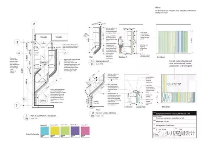 幼兒樂園的入口處設置了透明的玻璃門,純白色的金屬百葉窗,簡潔利落的百葉窗顯得美觀大方。入口的一側還設有接待臺,同樣是由柔和彎曲的彩色百葉窗造型設計而成。Babysteps的標識置于接待臺后面的墻上,五彩的字體設計更顯活潑可愛。燈光打在百葉窗上形成微妙的光影,使得BabySteps產(chǎn)生了一個工藝的視覺形象。