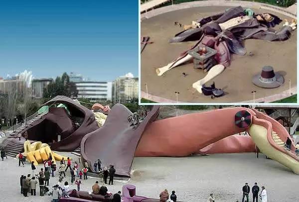 西班牙瓦倫西亞格列佛公園,是根據英國作家喬納森斯威夫特(Jonathan Swift)的《格列佛游記》(Gulliver's travels)中格列佛在航海船沉后飄到了小人國,在他疲憊沉睡時被小人國的城民用繩子將他捆綁在原地的場景,制作了巨大的格列佛造像。孩子們和前來游玩的人們恰似“小人國”里的城民,攀上各種“梯子”,探索這個龐然大物。
