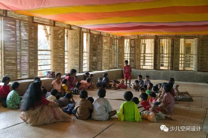 建筑的上層相對底層來說更加開放明亮,竹壁上的窗洞為樓上的師生體痛了 360 度的風景。寬敞的內部空間也為運動預留了足夠的場地。樹梢和池塘的景色通過窗戶進入二樓,來自竹條的光影穿過地板的縫隙,和天花板上紗麗鮮艷的色彩形成對比。